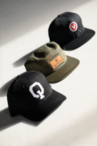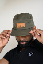 Composition: Olive green organic cotton twill. Faux Leather embossed patch, adjustable back.